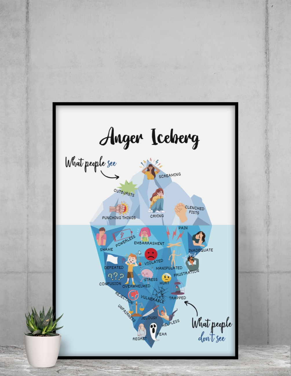 - The Anger Iceberg Poster is a visual representation of the idea that anger is often just the tip of the iceberg. The hidden parts of the iceberg represent the underlying emotions and thoughts that contribute to anger. This poster can help you to better understand your own anger and to develop healthier ways of managing it.